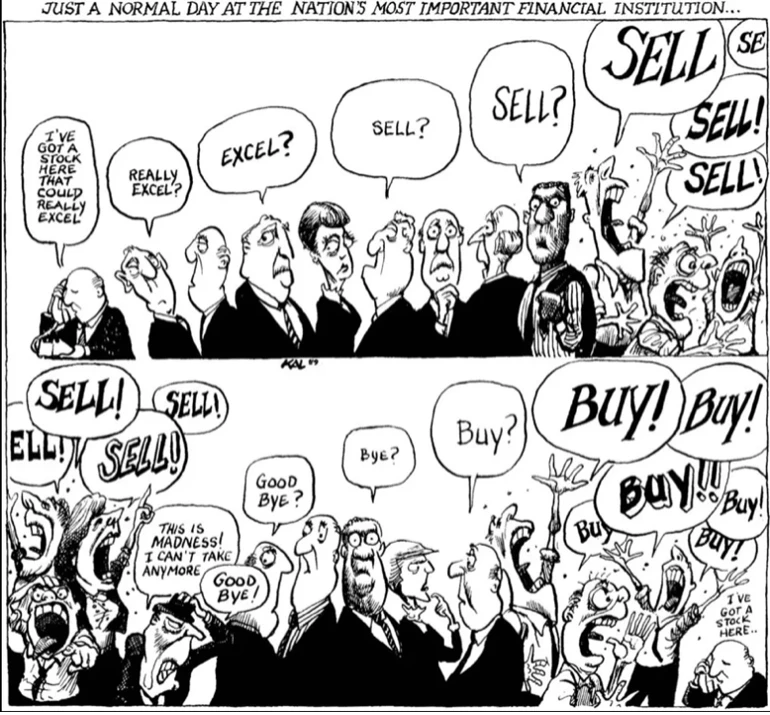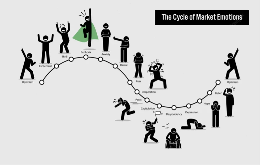 Aquí tienes una imagen humorística que refleja muy bien de lo que estoy hablando y cómo los sentimientos positivos y negativos se transmiten entre los inversores.